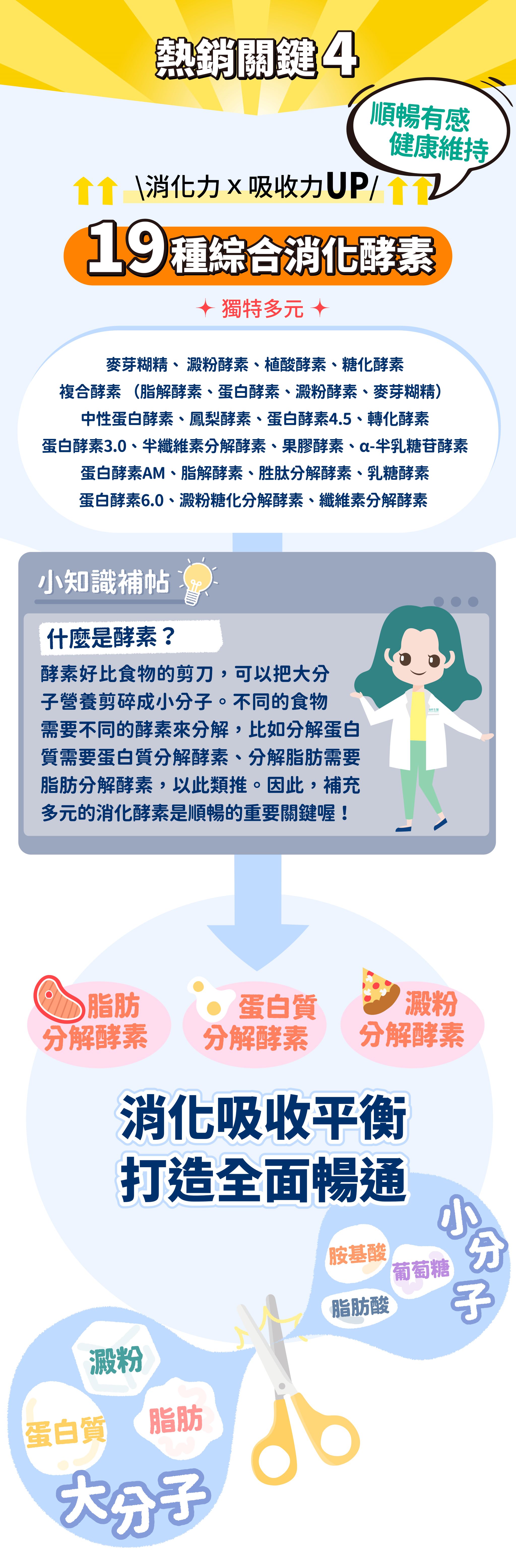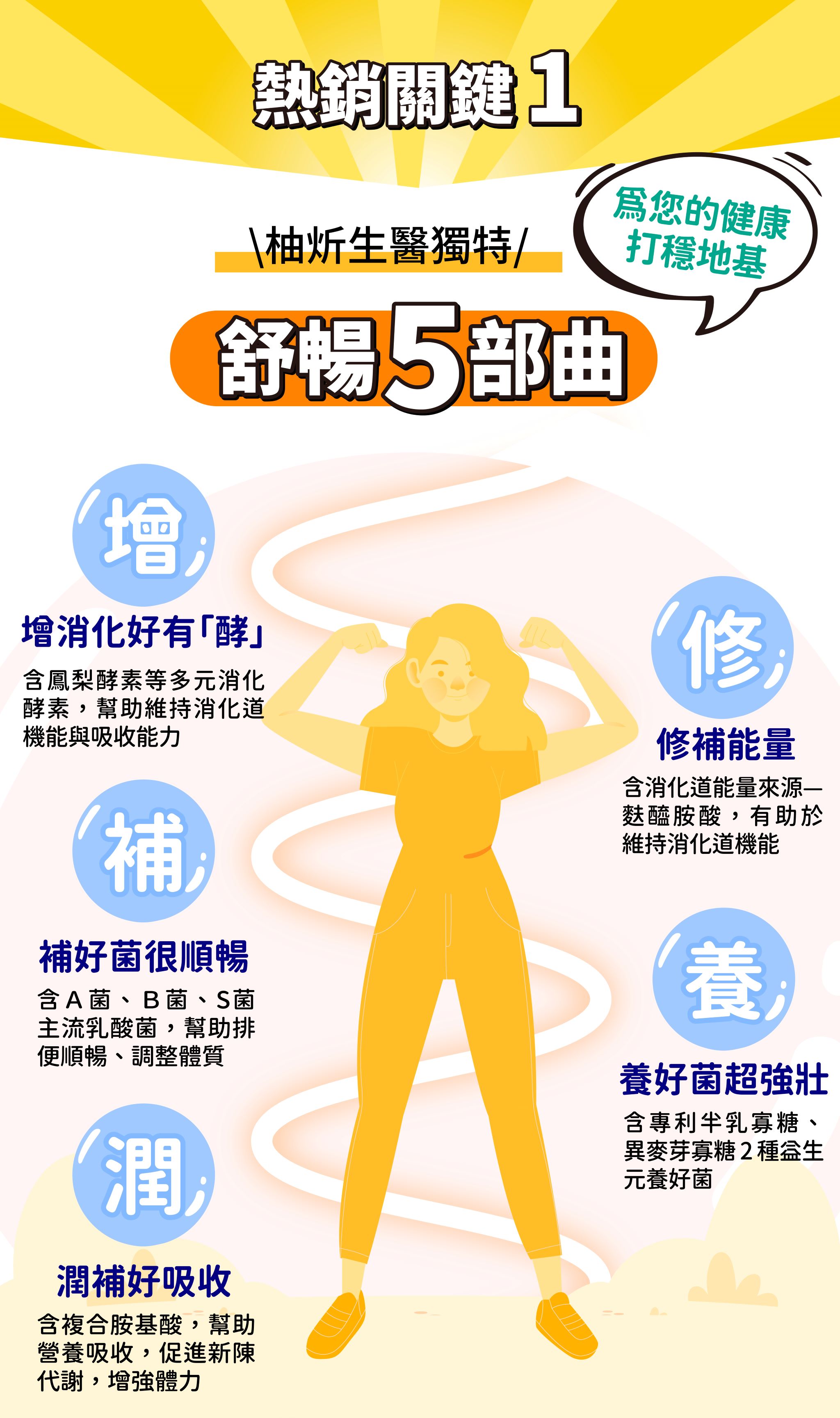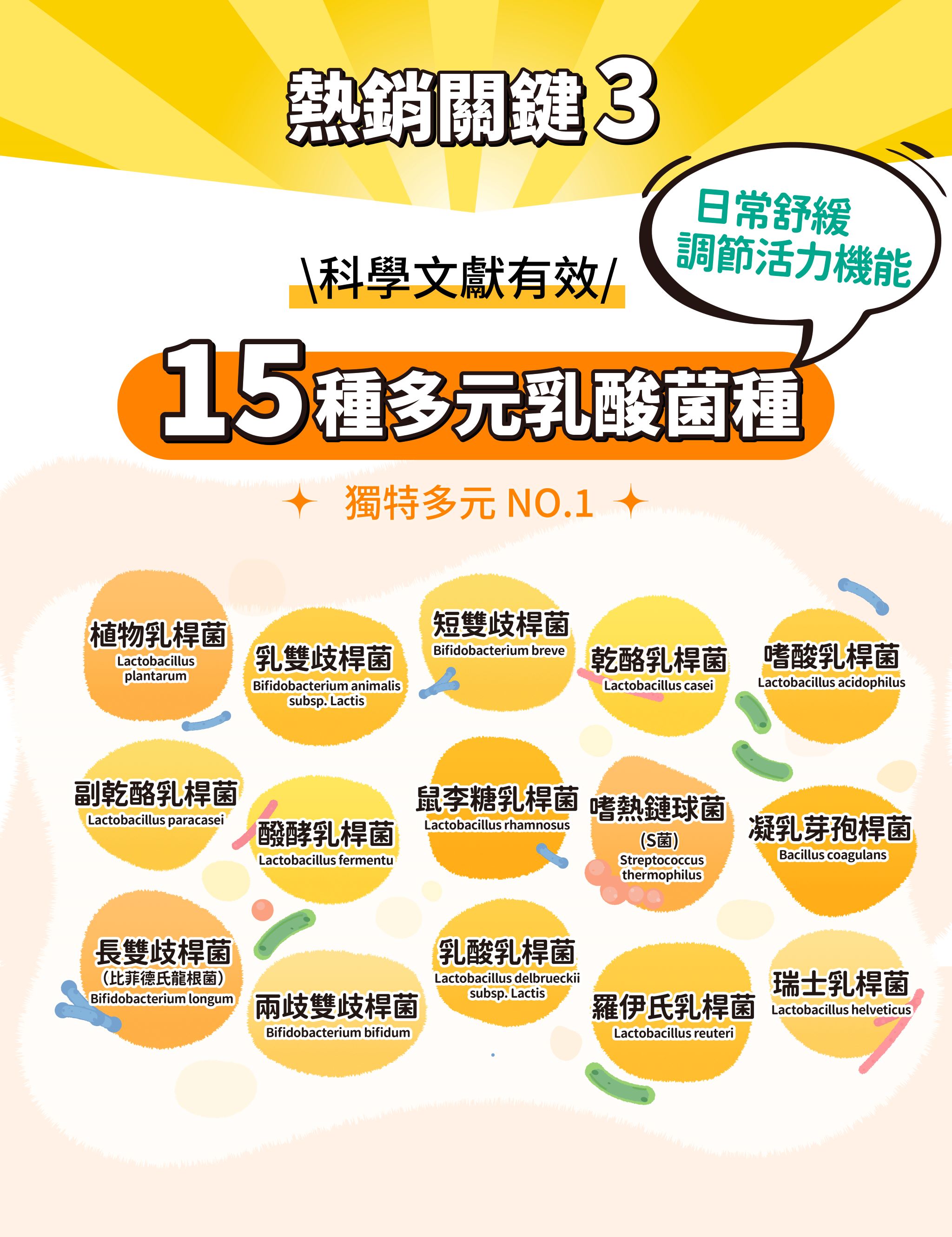 成分:玉米來源可溶性纖維、異麥芽寡醣粉(異麥芽寡醣、麥芽糊精)、優格香料粉、綜合乳酸菌【綜合乳酸菌(Lactobacillus plantarum、Bifidobacterium animalis subsp. lactis、Bifidobacterium breve、Lactobacillus casei、Lactobacillus paracasei、Lactobacillus fermentum、Lactobacillus rhamnosus、Streptococcus thermophilus、Bacillus coagulans、Lactobacillus acidophilus、Bifidobacterium longum、Bifidobacterium bifidum、Lactobacillus delbrueckii subsp. lactis、Lactobacillus reuteri、Lactobacillus helveticus) 、麥芽糊精、微結晶狀 α-纖維素】、菊糖、二氧化矽、牛乳清蛋白-胺基酸複合粉【乳清蛋白、乳清蛋白(卵磷脂)、L-麩醯胺酸、牛磺酸、L-組胺酸】、綜合消化酵素【麥芽糊精、澱粉酵素、植酸酵素、糖化酵素、複合酵素(脂解酵素、蛋白酵素、澱粉酵素、麥芽糊精)、中性蛋白酵素、鳳梨酵素、蛋白酵素4.5、轉化酵素、蛋白酵素3.0、半纖維素分解酵素、果膠酵素、α-半乳糖苷酵素、蛋白酵素AM、脂解酵素、胜肽分解酵素、乳糖酵素、蛋白酵素6.0、澱粉糖化分解酵素、纖維素分解酵素】、半乳寡糖、檸檬酸